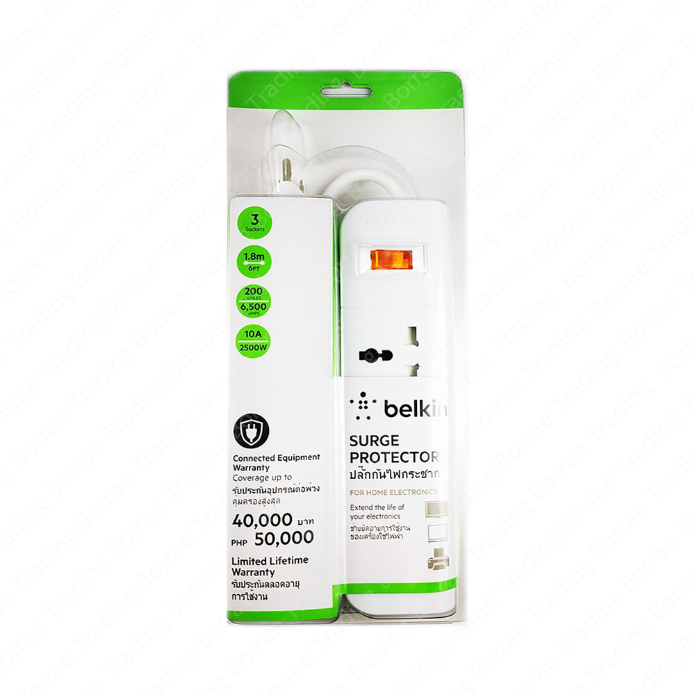 - Belkin รับประกันความเสียหายอุปกรณ์ที่ต่อพ่วงกับปลั๊กไฟกันกระชากของ Belkin ตามระยะเวลาประกันของปลั๊กไฟกันกระชาก และทำการชดเชยให้ไม่เกินมูลค่าที่ระบุหน้าแพ็คเกจสินค้า ไม่จำกัดจำนวนครั้ง ตามเงื่อนไขที่กำหนด